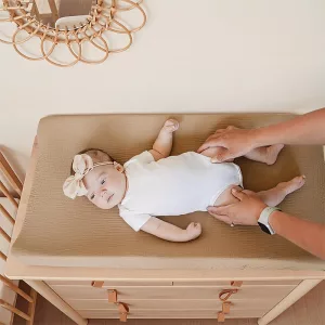 A kicsim hűvösebbnek és nyugodtabbnak tűnik pelenkázás közben. A pamut anyag kíméletes, a rendetlenségek tisztítása pedig gyors és könnyű.