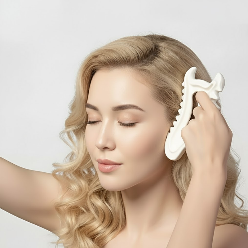A gua sha ragyogóvá és egészségessé teszi az arcomat minden erőfeszítés nélkül. A kerámia eleinte hűvös, ami nagyon nyugtató.