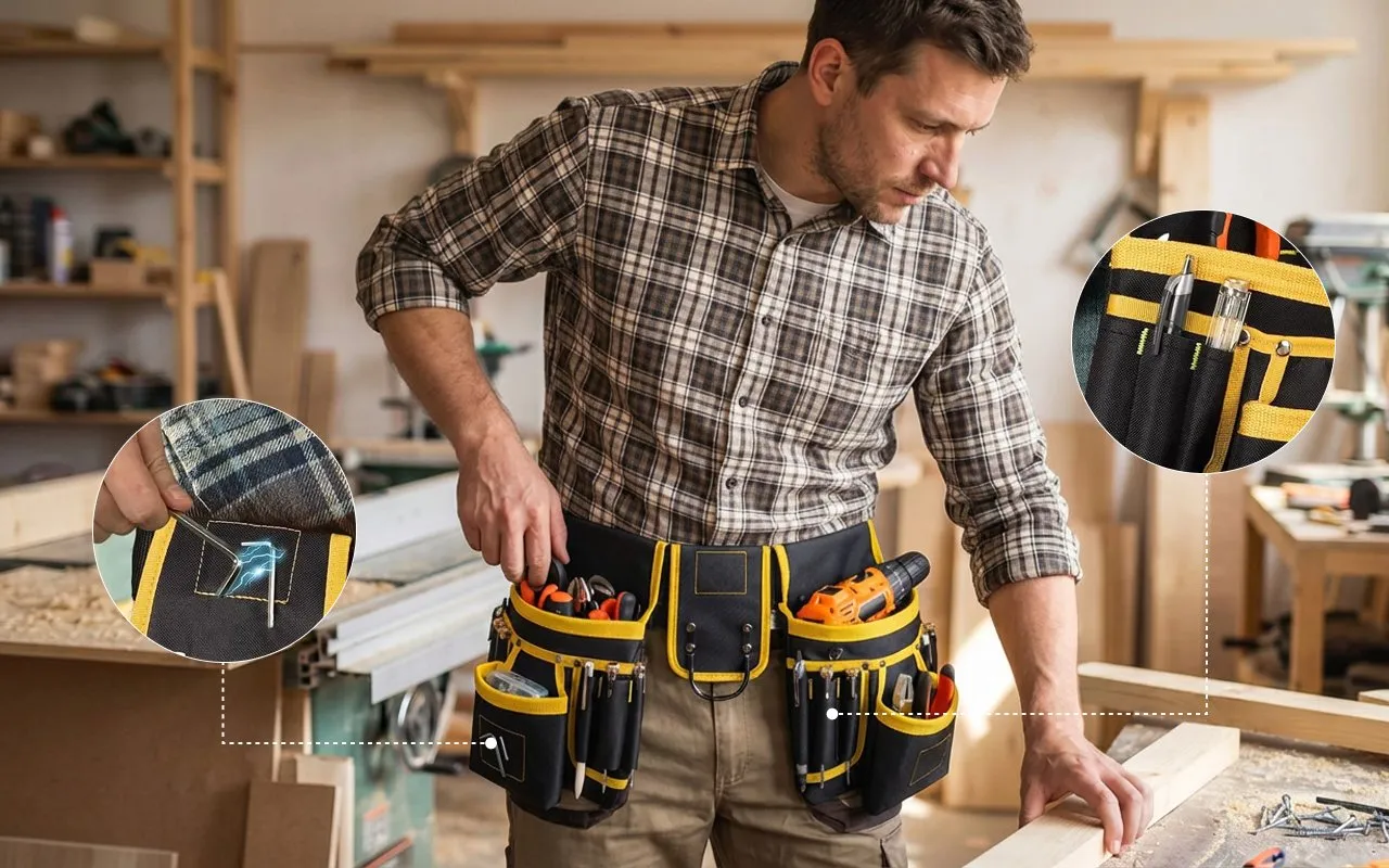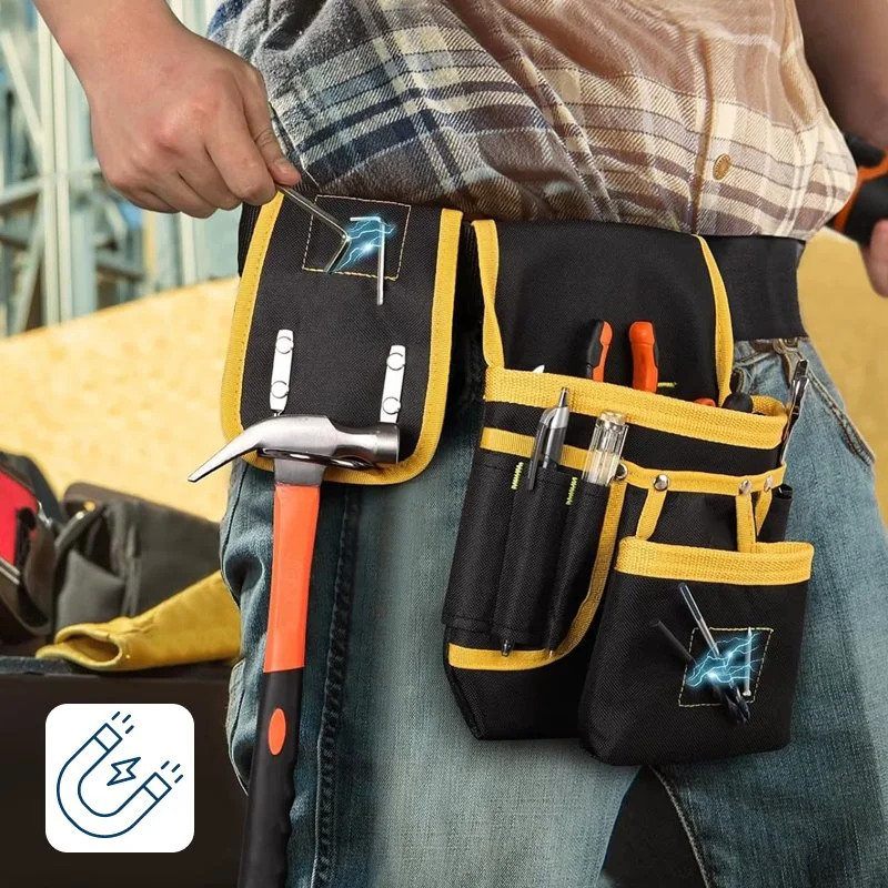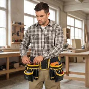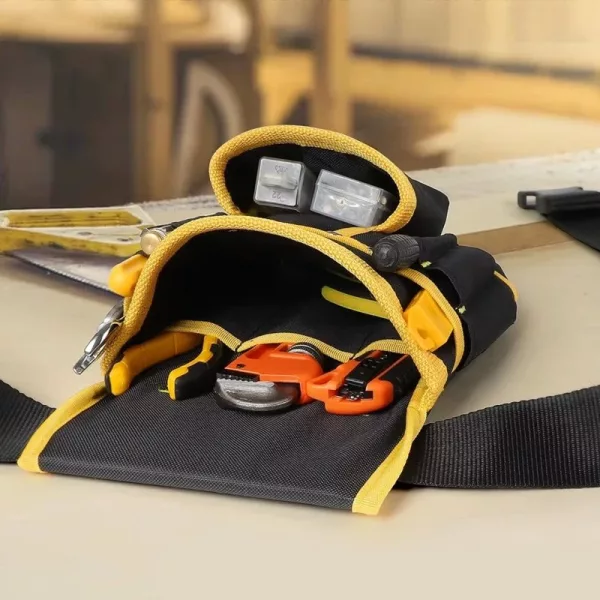 Hosszú műszakok alatt viselem ezt a táskát házak vezetékezésénél. A párnázott öv megkíméli a csípőmet, és anélkül elérem a szalagot, vágót, csavarokat, hogy lenéznék.