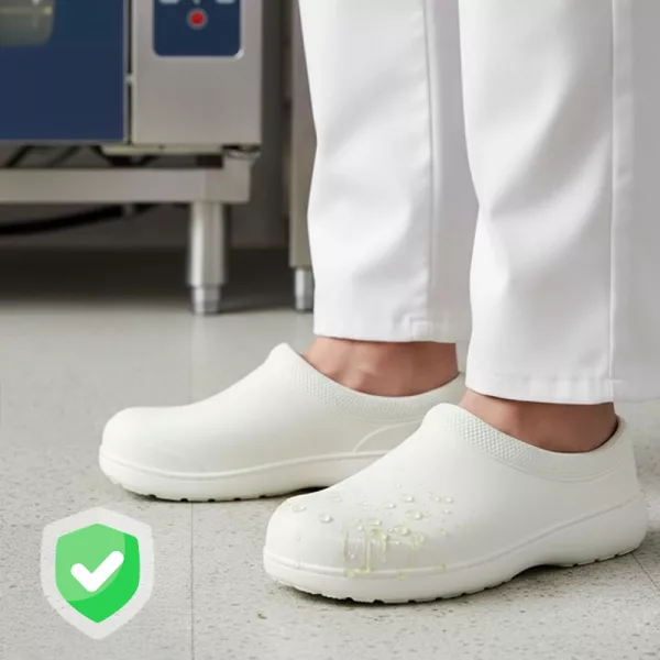 Nagyon könnyű tisztítani minden műszak után. Régebben fájt a lábam, de ezekkel a konyhai cipőkkel fájdalommentesen állhatok zárásig.