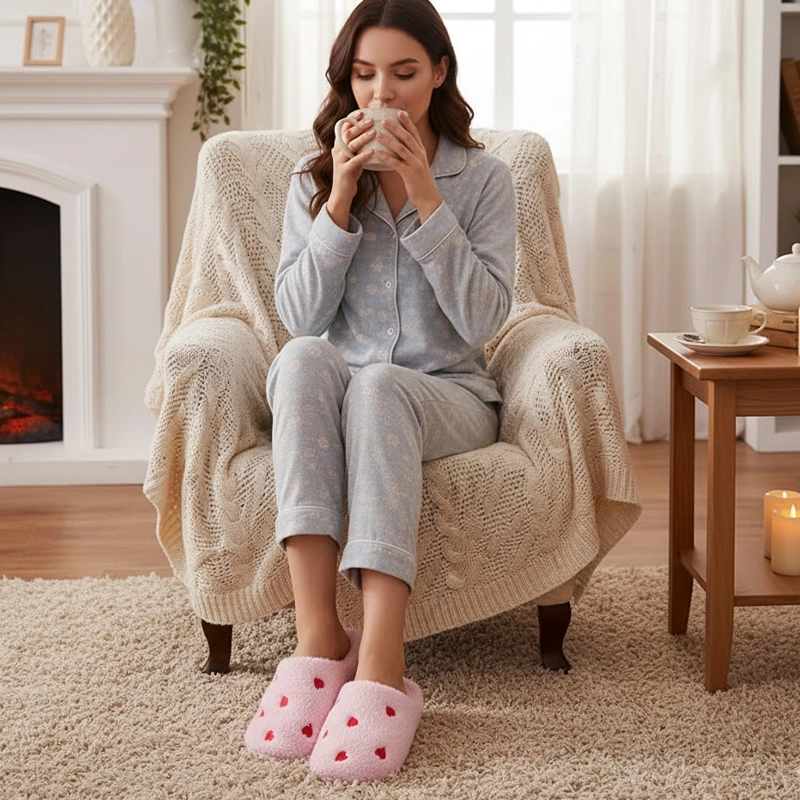 Élvezze a nyugodt estét otthon anélkül, hogy fázna a lába. Minden lépés kíméletes a szőnyegen és a kemény padlón is. A játékos szív minta mosolyt csal az arcára. A puha talp segít halkan közlekedni minden helyiségben.