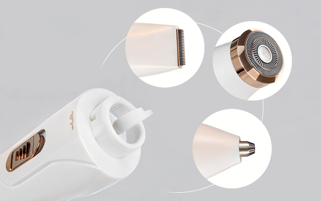 A három fej a kezelendő arc, hónalj, láb és bikinivonal számára készült. Egy kompakt készülék bárhol elfér, így a szőrtelenítés mindenhol erőfeszítés nélkül végezhető.