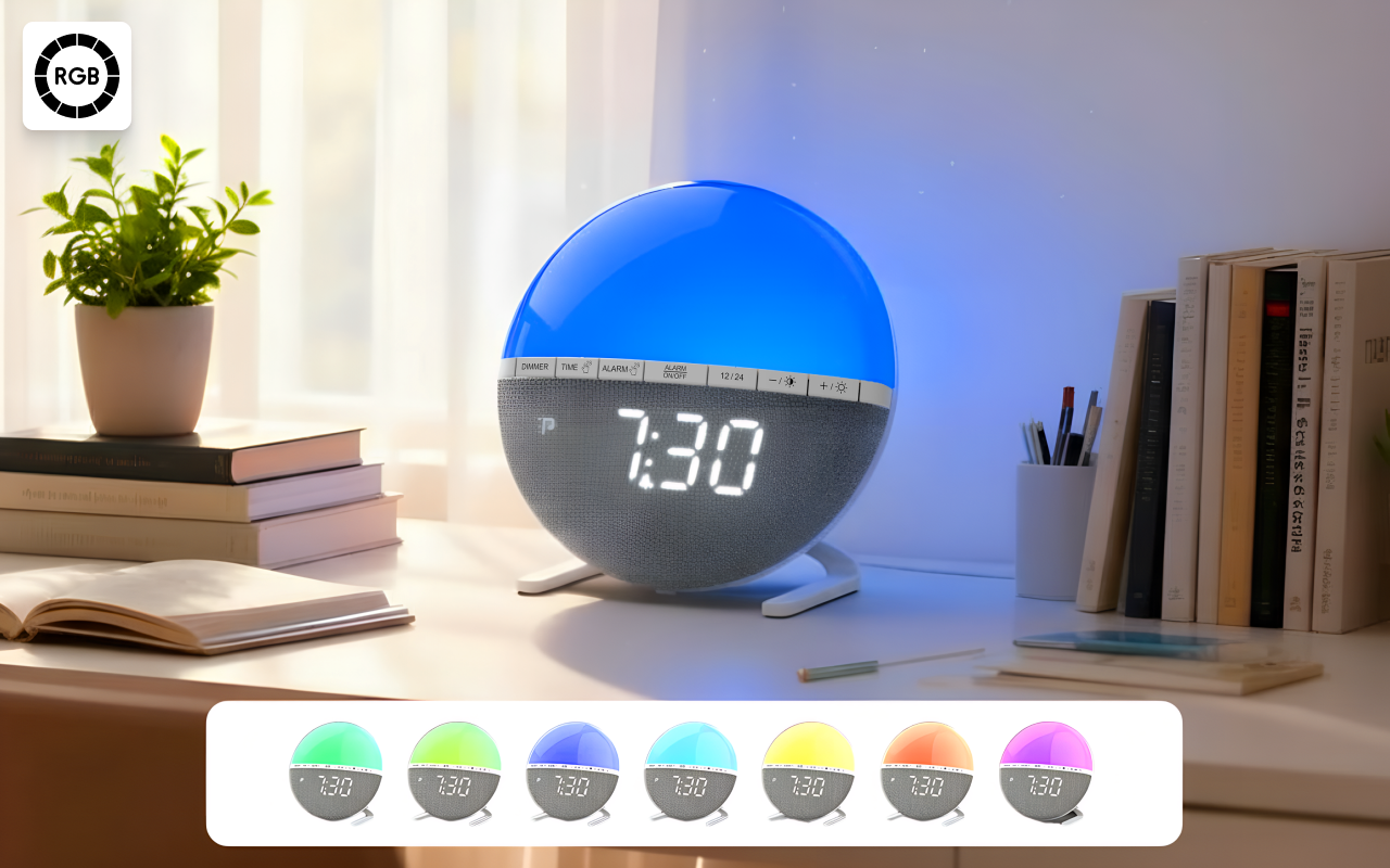 Válassz hét nyugtató hang közül vagy csak a napfelkelte fényt. Tíz hangerőszint biztosítja, hogy mindenki megtalálja a tökéletes reggeli rutinját.