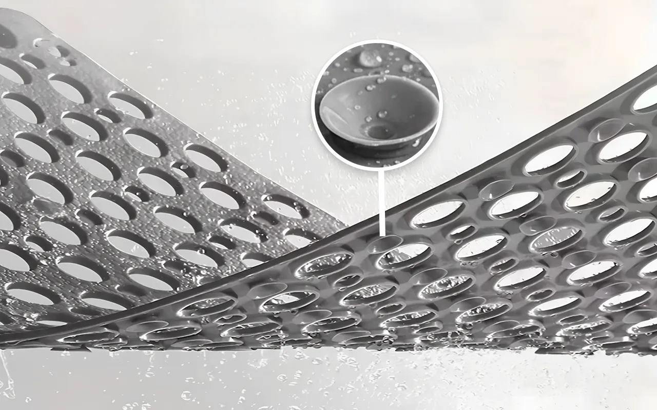 A nagy szilárdságú tapadókorongok biztonságosan a helyén tartják a szőnyeget a nedves csempén. Családod magabiztosan mozoghat, hirtelen megcsúszások nélkül.