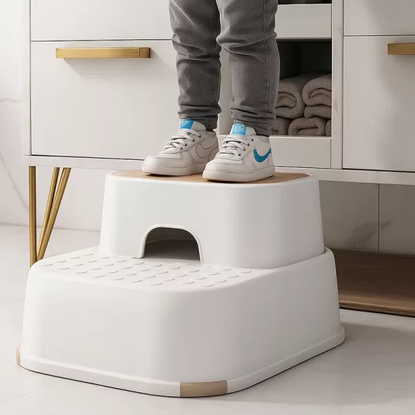 A két szint lehetővé teszi a kicsiknek, hogy könnyedén elérjék a magasabb felületeket. Az olyan feladatok, mint a kézmosás vagy fogmosás, egyszerűvé válnak.