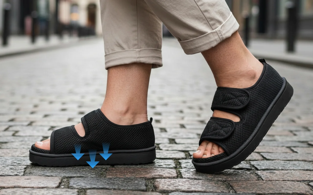 A széles tépőzáras pánt gyors állítást tesz lehetővé a kényelmes illeszkedésért. Biztosan tartja a cipőt anélkül, hogy az érzékeny területeket szorítaná.