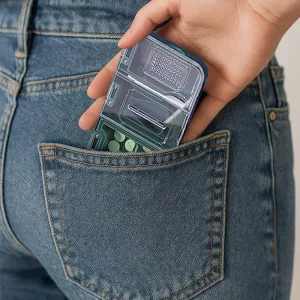 Nedvességálló szilikon bárhol szárazon tartja a tartalmat. Könnyű kialakításával magabiztosan viheti gyógyszereit bárhová.