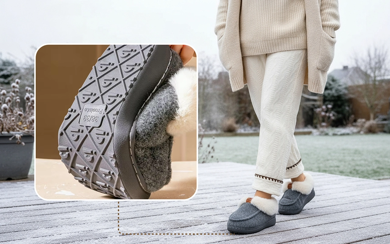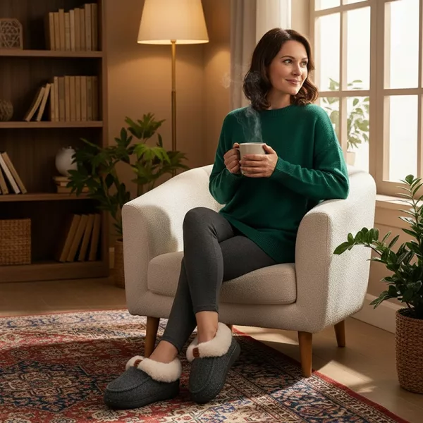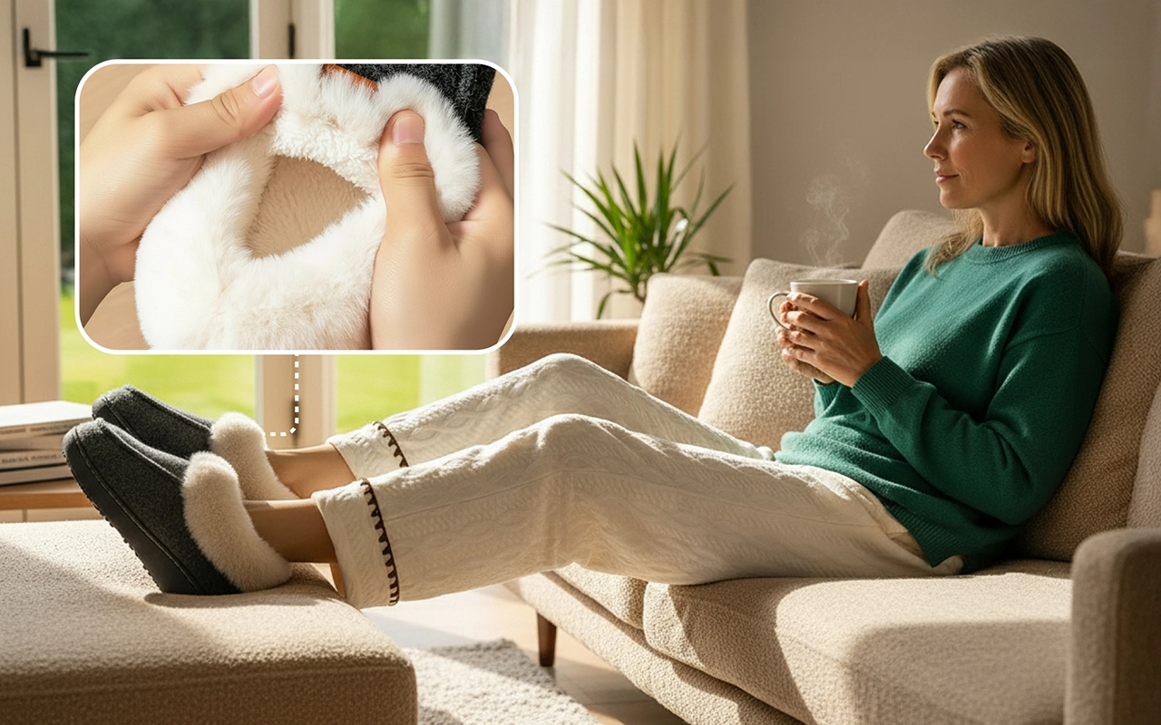 A vastag plüss bélés gyengéd puhasággal öleli körbe lábaidat. Tökéletes a hűvös reggelekre vagy a munka utáni otthoni pihenéshez.