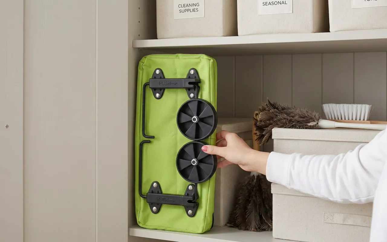 Vállműtét után vettem meg ezt a kocsit. Most már gond nélkül pakolom bele a nehéz üvegeket és gyümölcsöt. Másodpercek alatt összecsukható, és könnyen becsúsztatható a szekrény mellé.