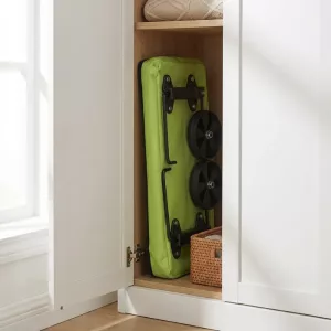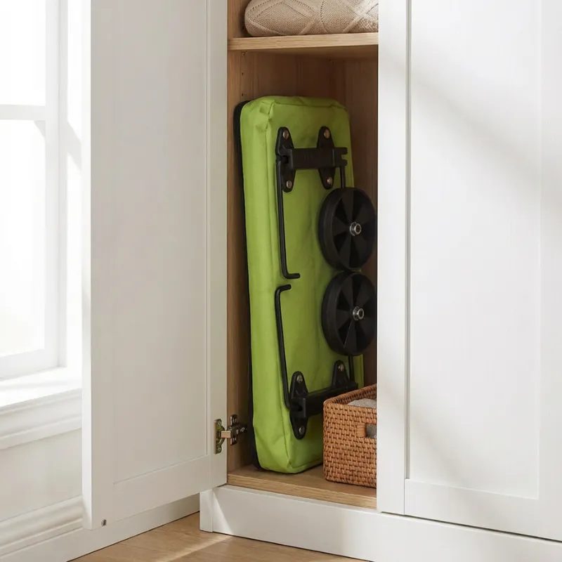 A kocsi keskeny csomaggá hajtható, amely elfér szűk szekrényekben. Könnyű váza rendezetten lóghat az ajtók mögött, értékes helyet szabadítva fel az előszobában.