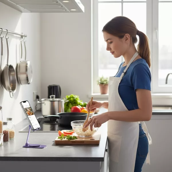Ezt az összecsukható állványt a konyhában használom, hogy főzés közben FaceTime-oljak a családdal. Távol tartja a telefont a kifröccsenő dolgoktól, mégis jó szögben tartja.