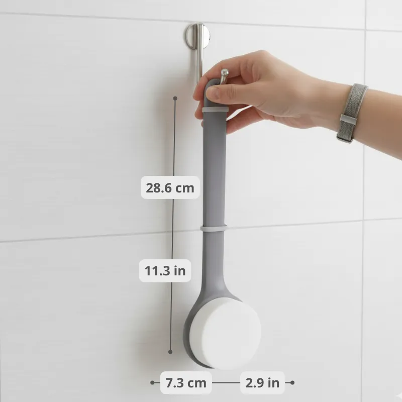A nyél stabil és kényelmes fogni. Minden használat után kampóra akasztom. Sosem volt még olyan kefe, ami ennyire jól működött a vállamon és a derekamon.