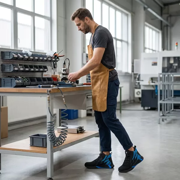 Egy forgalmas autószervizben dolgozom, és kellett valami strapabíró, de nem nehéz bakancs. Ezek a sportcipők hűvösen tartják a lábam, az acélbetétes orr biztonságosnak érződik, és a talp jól tapad az olajos foltokon.