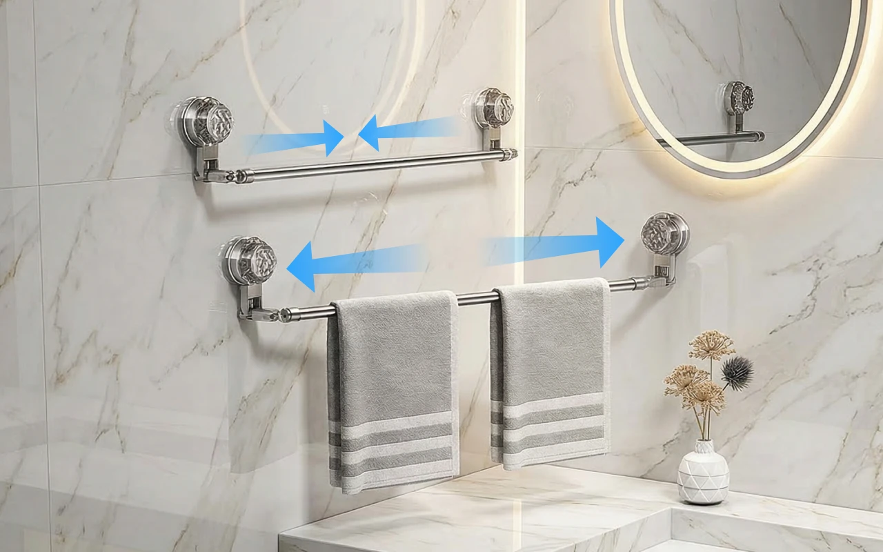 A kisméretű fürdőszobánkba vettem. A rúd állítható, így illeszkedik a falfelülethez, és a tapadókorongok sokkal erősebben tapadnak az üveghez, mint vártam.