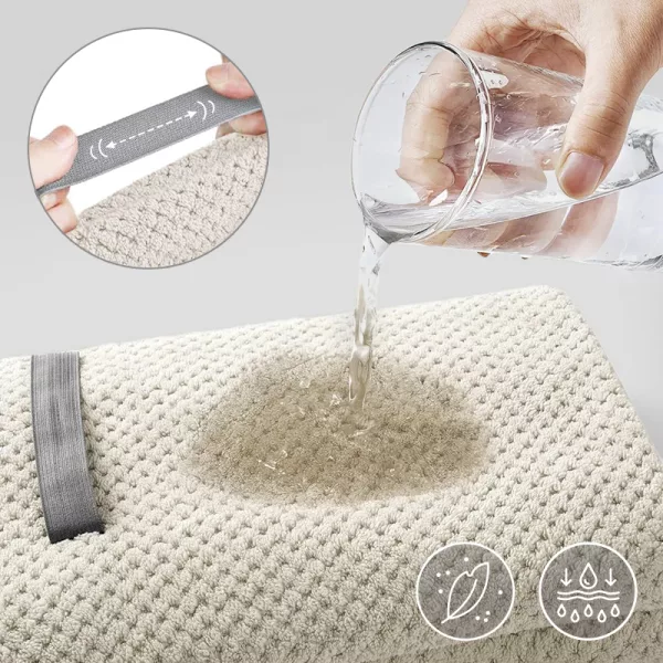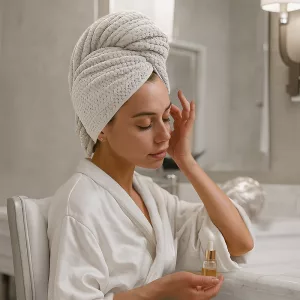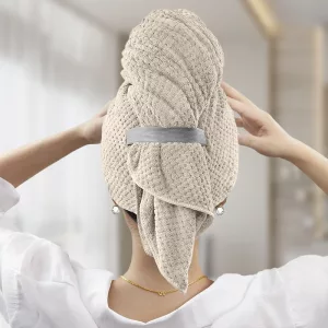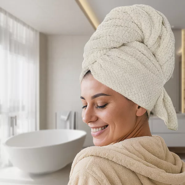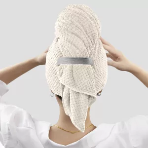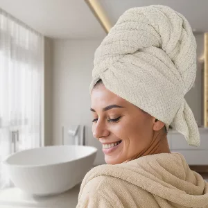 A mikroszálas anyag csodás—kíméletes a fejemhez, és a hajam szupergyorsan szárad! Nincsenek már vizes foltok vagy nehéz törölközők, amik lecsúsznának. Nem váltanék vissza.