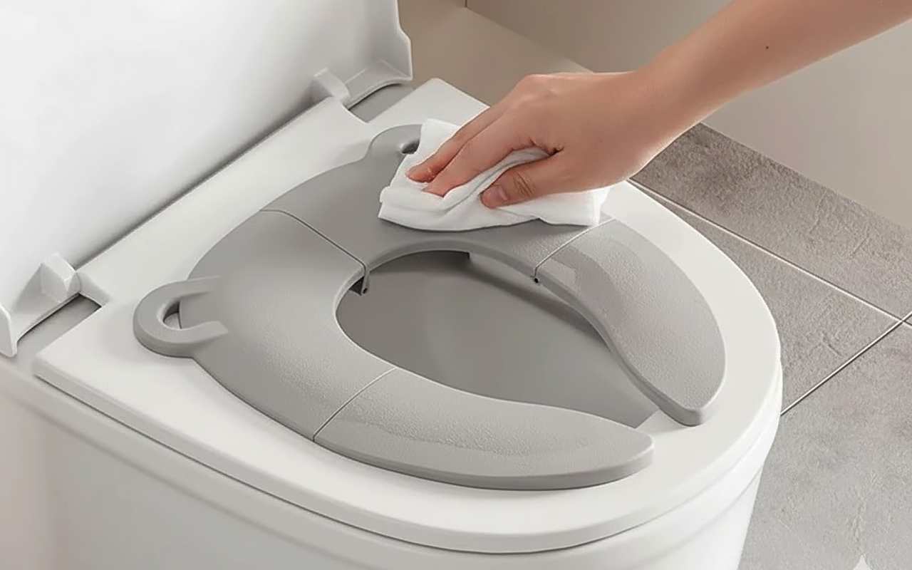 A csúszásgátlós hátoldal miatt nyugodtabb vagyok, amikor a fiamnak segítek a park WC-jében. Ő stabilan marad, és büszke, hogy nagynak érezheti magát.