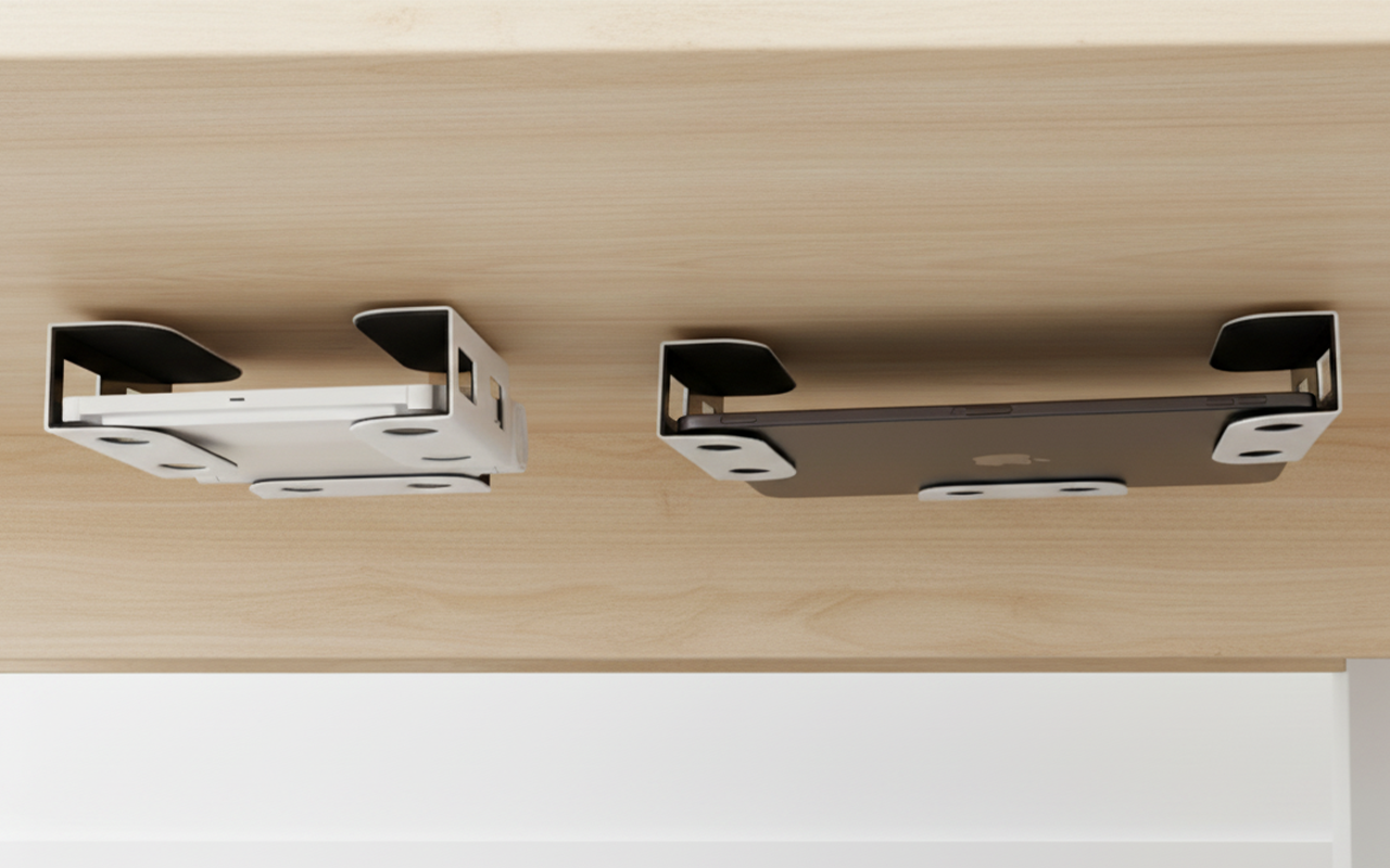 Könnyedén elhelyezhető laptopok, mini számítógépek és TV boxok számára az asztal alatt. A rugalmas méretezés gyorsan alkalmazkodik a különböző formákhoz vagy márkákhoz.