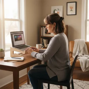 Minden reggel az ablak mellett ülök a kávémmal és a laptopommal ezen az állványon. A fa meleg tapintású, és sosem csúszik el gépelés közben.